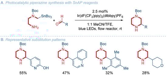 While SnAP and SLAP chemistry have become widely available for the synthesis of piperazines, including the commercial availability of the reagents [,], incompatibility with select substrate combinations and toxicity of tin still limited the applications of these methods. To address this problem, Bode and coworkers reported the use of photoredox catalysis under continuous flow conditions (Scheme 7) []. In contrast to the previously described SnAP methodology, this approach made use of a single photoredox catalyst replacing the combination of copper and amine ligands, which resulted in a simplified reaction workup. Notably, unlike SLAP chemistry, which also uses a single catalyst, this flow method also allows access to synthetic easily modifiable N-Boc C-2 functionalized piperazines. Perhaps most important is the operational mode of the reaction under continuous-flow conditions, which facilitates reaction scale-up and offers simplified operational conditions. Thus, although tin reagents are still used, the continuous flow set-up makes this approach scalable and efficient, while safety concerns are at least minimized by limiting contact with the reagents.