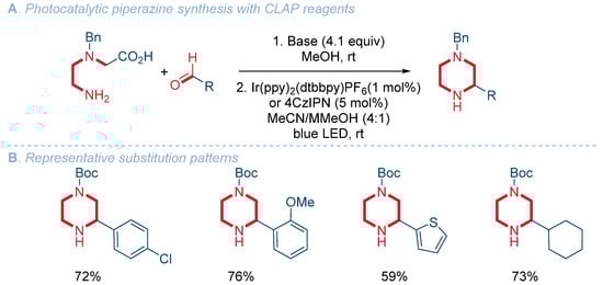 - Gueret, R.; Pelinski, L.; Bousquet, T.; Sauthier, M.; Ferey, V.; Bigot, A. Visible-Light-Driven CarboxyLic Amine Protocol (CLAP) for the Synthesis of 2-Substituted Piperazines under Batch and Flow Conditions. Org. Lett. 2020, 22, 5157–5162. [Google Scholar] [CrossRef]