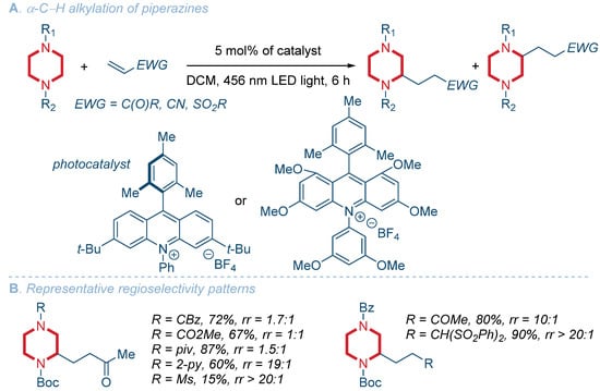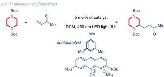 - McManus, J.B.; Onuska, N.P.R.; Jeffreys, M.S.; Goodwin, N.C.; Nicewicz, D.A. Site-Selective C–H Alkylation of Piperazine Substrates via Organic Photoredox Catalysis. Org. Lett. 2020, 22, 679–683. [Google Scholar] [CrossRef] [PubMed]