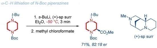 - Firth, J.D.; O’Brien, P.; Ferris, L. Synthesis of Enantiopure Piperazines via Asymmetric Lithiation-Trapping of N-Boc Piperazines: Unexpected Role of the Electrophile and Distal N-Substituent. J. Am. Chem. Soc. 2016, 138, 651–659. [Google Scholar] [CrossRef] [PubMed]