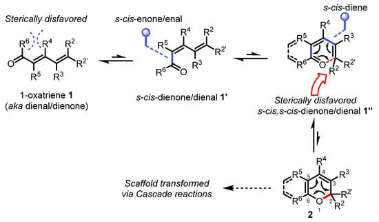 Although all carbon electrocyclic reactions (4π, 6π, 8π,and even 12π [10]) have played an important role in advancing asymmetric intermediates towards complex natural products, excellent reviews on this topic exist and will not be repeated herein [6,7,8]. 2H-pyrans and related 2H-benzopyrans are privileged scaffolds found in natural products which have attracted the interests of synthetic chemists for decades [11,12]. Interestingly, synthetic examples of these heterocycles are relatively scarce due to their innate instability as a consequence of the high reversibility of the oxa-6π electrocyclization (forward- and retro-). This electrocyclic reaction entails a key σ-bond formation between the termini of an 1-oxatriene scaffold 1 via a π-electron redistribution permitted by the principle of orbital symmetry conservation (Scheme 1). The oxa-6π electrocyclization is typically in fast equilibrium with the retro-oxa-6π due to the thermoneutrality often invoked between the opened and closed valence tautomers (isomers) of 2H-(benzo)pyrans, and the relatively low-energy barriers of the various interconversion transition states (Scheme 1) [13,14]. For example, if R5 = R6 = H, s-cis/s-trans dienal conformers 1′ and 1″ will exist in dynamic equilibrium between 1 and 2. In regards to enones 1, if R5 and R6 are forming a ring, or if R4 is a bulkier substituent than R5, the R4/R6 steric clash will effectively destabilize the s-trans conformation towards s-cis enone 1′ exclusively, thus enabling a possible equilibrium shift towards the s-cis,s-cis dienone 1″ [15,16,17]. Another steric clash occurs when R2 ≠ H or for disubstituted R2/R2′ ≠ H in terminal E-alkenes, thus forcing the s-cis,s-cis dienone π-system of 1″ out of conjugation which ultimately results in a favorable oxa-6π electrocyclic ring-closure towards the 2H-pyran isomer 2. Aside from these steric factors, the oxa-6π electrocyclic ring-closure is also favored towards 2H-(benzo)pyrans 2 by the presence of either electron-withdrawing groups at the C5 and/or C6 positions (reduced nucleophilicity of the enol ether moiety), or the stabilizing π-aromaticity of arenes (C5-C6) [18,19]. For most oxatriene substrates 1 which do not possess the stereoelectronic characteristics mentioned above, the oxa-6π electrocyclic ring-closure is often reversible unless being funneled through a cascade reaction [20,21]. As such, the total synthesis of (+)-torreyanic acid by Porco involving a oxa-6π electrocyclization/Diels−Alder cycloaddition cascade rapidly became a classic biomimetic reaction demonstrating how a 2H-pyran can be seamlessly transformed into a much more complex natural scaffold (Scheme 2).