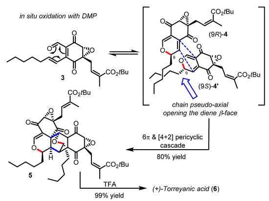 Torreyanic acid (6) isolated from the endophytic fungus Pestalotiopsis microspore was proposed by Clardy to arise from a Diels−Alder dimerization of two 2H-pyran epimers which could have been formed in situ through the oxa-6π electrocyclization of a single epoxy-quinone precursor [22]. Indeed, Porco was able to validate this biosynthetic hypothesis, by designing a biomimetic cascade reaction that entailed the oxidation of a starting alcohol (not shown) into the enantiopure quinone epoxide 3 as a trigger for the spontaneous disrotatory oxa-6π electrocyclization and the ensuing dimerization (Scheme 2) [23,24]. A related strategy of mild oxidation as a means to produce a reactive oxatriene moiety and initiate an oxa-6π electrocyclic reaction in tandem was recently reported in a route towards the papuaforin A-C natural products [25]. The exquisite diastereoselectivity observed in the heterodimer product 5 was consistent with the theoretical energy-minima calculations from several competitive reaction pathways, reaction intermediates, and transition states computed on a model substrate at B3LYP/6-31G* level of theory. Briefly, the results suggested that both 2H-pyran epimers 4/4′ could be easily accessible (similar potential energy) and in rapid equilibrium (ΔΔG‡ ~5.0 Kcal/mol), while the syn-pyran (9S)-4′ in which the pentyl side-chain adopts an axial orientation possess a thus more sterically accessible diene (anti face to the epoxide moiety) for the Diels−Alder cycloaddition to occur. It was therefore clearly demonstrated that the Diels−Alder dimerization stereoselectivity obtained in the heterodimer 5 was fully controlled by the pair of 2H-pyran epimers. These results were further confirmed by Hayashi during the synthesis of related epoxyquinol A-C natural products [26]. A similar platform involving a tandem oxa-6π electrocyclization/Diels−Alder cycloaddition has found interesting applications in the synthesis of highly functionalized “natural product-like” molecules [20].