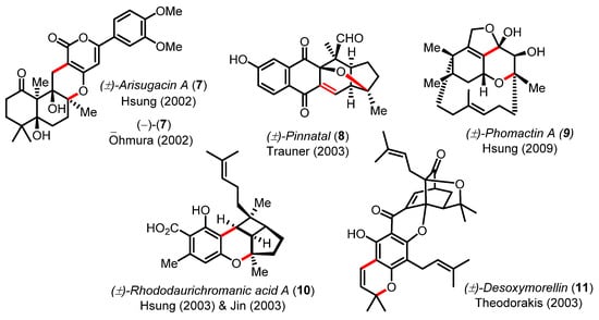 Examples of structural bond formation from natural products synthesized by oxa-6π electrocyclizations in tandem Knoevenagel condensations or Claisen rearrangement.