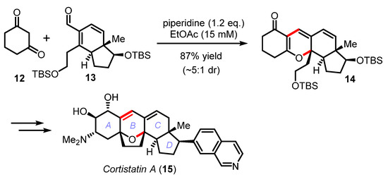 Although this cascade reaction has been pivotal in the synthesis of numerous natural products (e.g., arisugacin A (7) [29,30,31], pinnatal (8) [32], phomactin A (9) [33,34], rhododaurichromanic acid A (10) [35,36], or desoxymorellin (11) [37]), no real improvements in terms of catalysis (piperidine, piperidinium, or ethylene diamine diacetate (EDDA)) have been recently proposed except for the practical and efficient reaction in water by Lee [38] and the DABCO-catalyzed electrocyclization of dienyl α-diketones by Frontier [39]. This cascade reaction was also exploited by Hirama in the synthesis the marine steroidal alkaloids, cortistatins A and J (Scheme 4) [40,41]. The one-step union of cyclohexane-1,3-dione 12 with the advanced CD-ring building block 13 was mediated by piperidine to irreversibly deliver the tetracyclic product 14 in 87% yield and high diastereoselectivity (~5:1 dr). In this effort, Yamashita and Hirama had to meticulously optimized the Knoevenagel/oxa-6π electrocyclization cascade to form the pivotal B ring common to all the cortistatin natural products and avoid the formation of undesired structural isomers [41].