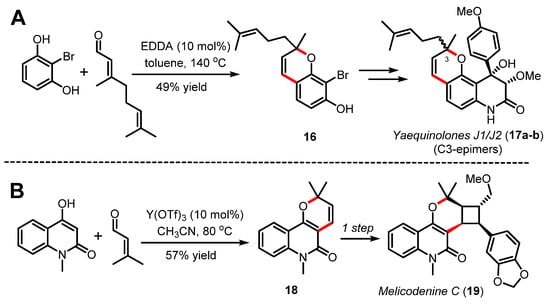 Along these lines, Quinn [42] and more recently Heretsch and Christmann [43] have exploited an organocatalyzed Knoevenagel/oxa-6π electrocyclization cascade towards the assembly of pyranopyridone-based natural products [44]. In their streamlined synthesis of yaequinolones J1/J2 (17a-b) in five steps, Heretsch and Christmann reported their efforts in optimizing the 2H-benzopyran forming step catalyzed by EDDA in toluene to prepare substrate 16 in 49% yield (Scheme 5A) [43]. As shown in Scheme 5B, the pyranopyridone scaffold can also be applied directly to the synthesis of 2H-pyran 18 through a Knoevenagel/oxa-6π electrocyclization sequence catalyzed by ytterbium triflate, thus affording a genuinely straightforward synthesis of melicodenine C (19) [42]. The same year, Zografos and coworkers reported a more systematic study to access pyranopyridones via a Knoevenagel/oxa-6π electrocyclization process for the synthesis of structurally diverse natural-product-like pyridines [45].