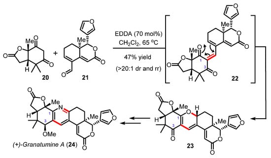 Another exciting example was reported recently by Newhouse with the ten-step synthesis of a limonoid alkaloid (+)-granatumine A (24) (Scheme 6). In this synthesis, Newhouse and his group fully exploited the reversibility of the oxa-6π electrocyclization to cleverly transform the central 2H-pyran heterocycle of 23 into the highly substituted pyridine ring of the natural product 24. The Knoevenagel/oxa-6π electrocyclization route between the cyclohexane 1,3-dione substrate 20 and the α,β—unsaturated aldehyde 21—once again catalyzed by EDDA [46] delivered the pivotal pentacyclic fused scaffold 23 in 47% yield with high diastereo- and regioselectivity. Through computational DFT (density functional theory) investigations and the experimental interconversion between pyran scaffolds, the authors demonstrated that the 2H-pyran C1-regioisomer 23 was indeed thermodynamically (ΔΔG° of ~2.8 Kcal/mol) and kinetically preferred and that the electrocyclization proceeded with an exquisite disrotatory torquoselectivity.