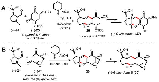 It is important to note that even if significant progress has been made in understanding the general diastereoselectivity outcome of the thermal oxa-6π electrocyclization (π6s disrotatory), the development of catalytic enantioselective methods towards enantioenriched 2H-pyrans is lagging far behind [47]. This statement is largely exemplified by comparing the synthetic strategies developed separately by both the Ito [48,49] and Gong/Yang [50] groups to deliver the asymmetric syntheses of several quignardone meroterpenoids (Scheme 7). The Ito group exploited the reactivity of a chiral synthetic C2-symetrical 1,3-diketone 25 in the oxa-6π electrocyclization towards the tricyclic pyran 26 in order to control facial selectivity at late-stage hydrogenation and deliver (−)-guinardone I (27) in an enantioslective manner. On the other hand, Gong and Yang exploited the chirality of (D)-quinic acid available from the chiral pool to secure the two stereocenters of 1,3-diketone 28 in a relatively long sequence of sixteen steps. As shown in Scheme 7B, the cascade reaction developed to construct pyran 29 was mediated by piperidine and acid similarly to the report by Ito.