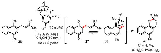 In 2020, an oxidative dearomatization for the generation of ortho-quinone methide with exquisite chemoselectivity has been reported to enable a series of tandem reactions such as the oxa-6π electrocyclization [56]. This novel and efficient synthetic strategy will certainly pave the way towards a more modern approach to complex 2H-pyran scaffolds (Scheme 9). In brief, the transition-metal-free conditions reported in this study enabled the direct oxidation of phenols (e.g., 36) at their benzylic positions using hypoiodite catalysis to trigger a dearomatization process forming ortho-quinone methide 37. As shown in Scheme 9, the highly reactive π-system of o-quinone methide 37 formed by oxidative dearomatization presumably undergoes a rapid s-cis/s-trans conformational equilibrium between 37 and 38 to enable the ensuing oxa-6π electrocyclization to take place and yield the expected 2H-benzopyran products 39 through a favorable rearomatization. This study reported by Ishihara will certainly find many novel applications in the realm of natural product synthesis given the potential of reactivity of transient ortho-quinone methides for tandem reactions. To complete this overview of tandem reactions, we should also note the unique method recently reported by Bonesi and coworkers via a photo-induced Fries rearrangement/oxa-6π electrocyclization manifold for the synthesis of chromanones [57].