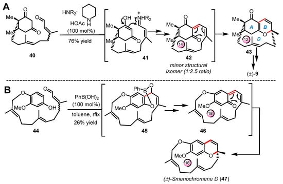 It is important to note that unlike the all the cases of intramolecular electrocyclizations shown in Section 2.1 and Section 2.2, the examples of oxa-6π electrocyclization presented below occur within either medium- or large-size macrocycles, hence their classification as “transannular” reactions. To our knowledge, the first example of transannular oxa-6π electrocyclization was reported by Hsung and coworkers in 2003 [58] during their efforts to build the structurally unprecedented ABD-tricyclic ring system of (±)-phomactin A (9) (Scheme 10A) [33,34]. In this route, a number of steps were required to install the citral-like side chain onto the cyclohexane 1,3-dione of enal 40 designed by Hsung as the starting material for the pivotal cascade reaction. As planned, substrate 40 was subjected to iminium-based activation to construct the 14-membered ring macrocycle 42 via a Knoevenagel-type condensation under high dilution conditions. The ensuing oxa-6π electrocyclization took place in tandem to deliver product 43 bearing the contracted 12-membered D-ring (22% yield) along with an undesired structural isomer (major product) formed around a smaller and more favorable 10-membered ring macrocycle. As shown in Scheme 10B, Trauner reported in 2005 a similar approach for the synthesis of the unusual ansa-terpenoid smenochromene D (±)-(47) [59]. This macrocyclic chromene natural product (aka likonide B) was initiated by first installing a long farnesyl-type side chain onto an hydroquinone to obtain the fully functionalized building block 44. In this study, Trauner and coworkers exploited a Nagata-type reaction mediated by phenylboronic acid to obtain the ortho-hydroxyalkylation product 45, which upon the effect of temperature further spontaneously proceeded to elimination via dearomatization to form the 18-membered ring macrocyclic intermediate 46. The ensuing rearomatization into the 2H-benzopyran heterocycle is likely a strong driving force to the final transannular oxa-6π electrocyclization occurring through the ring contraction of 46 into the 16-membered ring of the natural product (±)-(47).