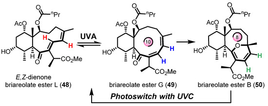 Transannular oxa-6π electrocyclization for the biomimetic interconversion of briareolate ester L (48) to B (50) controlled by a selective UVA/UVC photoswitch. Figure adapted with permission from the authors. Copyright 2017 American Chemical Society.