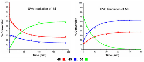 Finally, the most recent example was reported by West and Roche during the synthesis of briareolate ester B (50) shown in Scheme 11 [60]. Given the collective isolation of briareolate esters L (48), G (49), and B (50) from the octocoral Briarium asbestinum, it was naturally proposed that these briarane cembranoids could be biosynthetically related through a mechanism of isomerization (48 with 49) and oxa-6π electrocyclization (49 to 50). Surprisingly, the naturally occurring 2H-pyran scaffold of 50 presents an anti-Bredt bridgehead alkene suggestive of a highly strained oxo-bridged macrocycle [61]. As expected, the strained (E,Z) 1,3-diene system of briareolate ester L (48) isomerized rapidly into a more conjugated (Z,Z)-system under UVA-photoirradiation to produce the reactive but observable intermediate briareolate ester G (49) [62]. After about ten minutes of photoirradiation, the isomerization reached a steady-state and a photoinduced transannular oxa-6π electrocyclization took place in tandem to afford the highly functionalized briareolate ester B (50) in 60% yield. The synthetic cascade reaction validated the biosynthetic proposal hinging on the spectacular 10- to 8-membered ring contraction of 49 to 50. In the same study, a unique photochromic switch was also developed via a rapid retro-6π electrocyclization of 50 under UVC irradiation to produce a coexisting mixture of isomers 48 and 49. Similar photochromic switches are typically valuable tools in material chemistry and the new recent study by Pei and Zhou on a 1,8-dioxatetraene model will certainly find multiple applications in the realm of photochromic films [63].