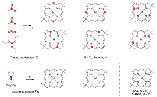 - Chen, C.-Y.; Bocian, D.F.; Lindsey, J.S. Synthesis of 24 Bacteriochlorin Isotopologues, Each Containing a Symmetrical Pair of 13C or 15N Atoms in the Inner Core of the Macrocycle. J. Org. Chem. 2014, 79, 1001–1016. [Google Scholar] [CrossRef] [PubMed]
