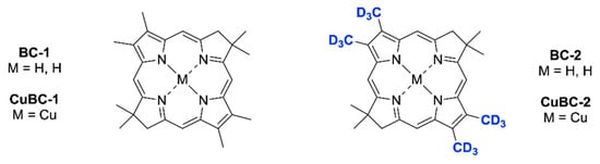 We considered the direct deuteriation of BC-1 to prepare BC-2. In this regard, Godziela and coworkers reported the partial exchange of the protons on the β-pyrrolic methyl groups of ClFe(III)-porphyrins upon treatment with tetrabutylammonium hydroxide in dimethylsulfoxide-d6 [36]. Given that (1) the exchange was incomplete and had an obligatory requirement for the presence of the ferric chelate, and (2) metalation of electron-rich bacteriochlorins is challenging [37], we elected to pursue the de novo synthesis of BC-2 beginning with suitable deuteriated precursors. The synthesis of pyrroles bearing deuteriated β-methyl groups is strongly precedented by work in the porphyrin arena, chiefly by Smith and coworkers [38,39,40,41,42,43,44]. A key question in the present work was whether such a deuteriated pyrrole could be converted with isotopic fidelity to the corresponding bacteriochlorin. Here, we present the synthesis of BC-2 and the copper chelate (CuBC-2), characterization of the isotopic purity, and investigation of the resonance Raman spectrum of CuBC-2 and analogues.