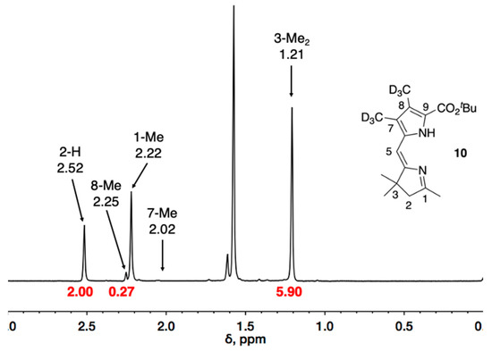1H NMR spectrum of 10 showing effects of deuterium incorporation, with peak integrations at the bottom in red.