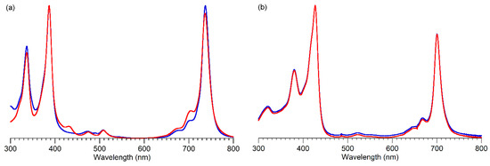 Panel (a): Absorption spectrum of CuBC-1 (blue line) and CuBC-2 (red line) in CH2Cl2 at room temperature (normalized in the B band). Panel (b): Absorption spectrum of CuBC-3 (blue line) and CuBC-4 (red line) in CH2Cl2 at room temperature (normalized in the B band).
