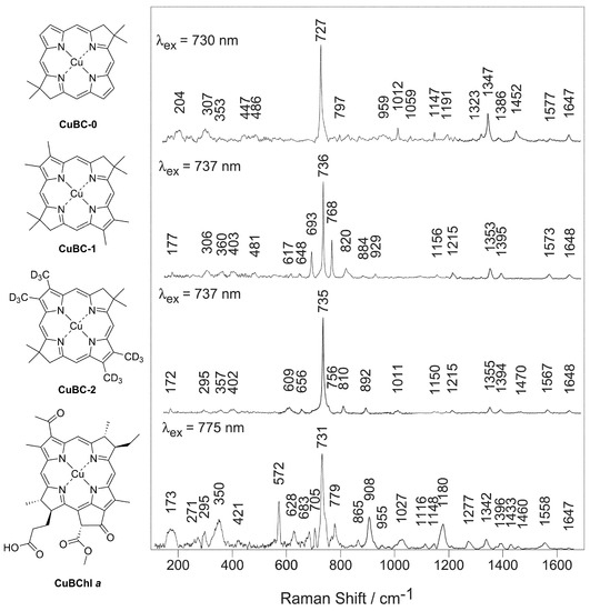 The resonance Raman (RR) spectra of CuBC-1 and CuBC-2 were examined. Qy-excitation RR studies of CuBC-1 and CuBC-2 are shown in Figure 4. The RR spectra can be compared with those of previous synthetic bacteriochlorins CuBC-0 and CuBC-1 [48], as well as that of CuBChl a [52], the copper chelate of bacteriochlorophyll a. The diagram illustrates our initial efforts at tuning vibronic complexity. The mid frequency region (800–1700 cm−1) of the RR spectrum of CuBC-1 is similar to that of CuBC-0 and exhibits only a few relatively weak bands. However, the low-frequency region (150–800 cm−1) of the RR spectrum of CuBC-1 exhibits additional features, particularly in the region surrounding the prominent feature at 736 cm−1. Vibrational calculations indicate that the 736 cm−1 band of CuBC-1 is the analogue of the 727 cm−1 band of CuBC-0. The additional features are relatively weak in the spectrum of CuBC-2.