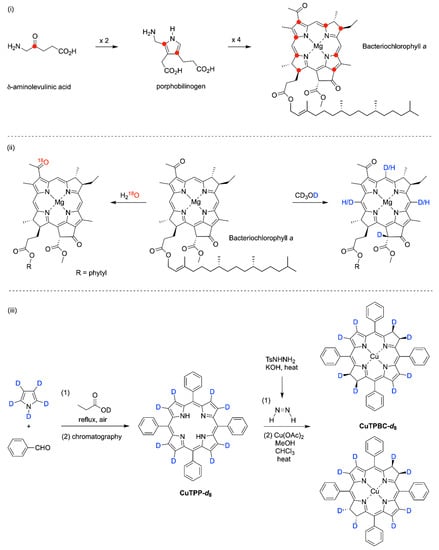 Routes to isotopically substituted bacteriochlorins. (i) Biosynthetic incorporation of isotopes. (ii) Isotopic exchange with native photosynthetic macrocycles. (iii) De novo synthesis of deuteriated bacteriochlorins from per-deuteriated pyrrole.