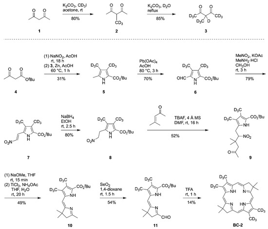 We followed Smith’s strategy for the preparation of pyrroles bearing deuteriated β-methyl groups [38,39]. Thus, acetylacetone (1) underwent alkylation with CD3I to give the reported 3-trideuteriomethyl-2,4-pentadione 2 [45], which was exhaustively deuteriated via underlying keto-enol tautomerism to give 1,3-diketone 3 [46] (Scheme 2). Treatment of 3 and tert-butyl acetoacetate (4) to the Paal-Knorr reaction [47] in hot acetic acid gave pyrrole 5 in 31% yield. The α-methyl group of 5 was found to have undergone exchange with loss of the deuterium substitution, whereas the deuterium substitution of the two β-methyl groups was found to be 91% and 97%. The selective loss of deuterium at the pyrrole α-methyl group, while fortuitous, was very convenient for the planned synthesis as deuterium was desired only at the methyl groups of the β-pyrrolic positions of the target bacteriochlorin. The α-methyl group of pyrrole 5 is destined to give the bacteriochlorin 10,20-positions, and an α-CD3 group of pyrrole 5 would give a C–D methine at the bacteriochlorin 10,20-positions. Pyrrole 5 was treated with lead acetate to give the pyrrole-carboxaldehyde 6 in 70% yield, which upon Henry reaction gave nitrovinylpyrrole 7 in 79% yield. Conjugate reduction with NaBH4 gave nitroethylpyrrole 8 (80% yield), which served as the nucleophile with Michael acceptor mesityl oxide in the presence of TBAF and molecular sieves [48] to give nitrohexanone-pyrrole 9 in 52% yield. McMurry cyclization gave dihydrodipyrrin 10 (49% yield), which upon Riley oxidation gave the dihydrodipyrrin-carboxaldehyde 11 in 54% yield. Treatment of 11 with neat TFA as described for the analogous natural abundance substrate [48] gave the tetrakis(trideuteriomethyl)bacteriochlorin BC-2 in 14% yield, a result that is typical for self-condensations of dihydrodipyrrin-carboxaldehydes [48] (Scheme 2).
