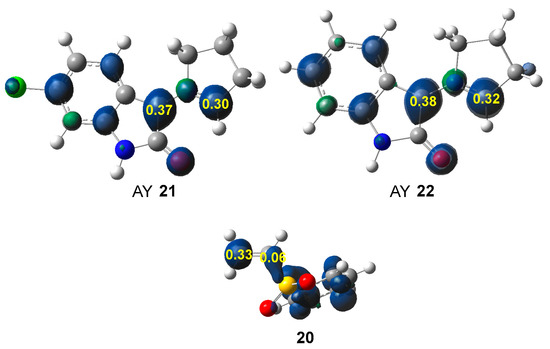 Along a polar reaction involving non-symmetric species, the most favorable reaction path involves the two-center interaction between the most electrophilic and the most nucleophilic centers [55]. Many studies have shown that the analysis of the electrophilic and nucleophilic Parr functions [56], resulting from the excess of spin electron density gathered via the GEDT [38] is one of the most accurate tools for the analysis of the local reactivity in polar and ionic processes. Hence, according to the characteristics of the reagents, the nucleophilic Parr functions of AYs 21 and 22, and the electrophilic Parr functions of vinyl sulphone 20 were analyzed (see Figure 2).