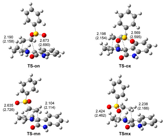 The geometries of the four TSs are given in Figure 3. The C–C distances between the four interacting carbons at the four TSs indicates that they correspond with high asynchronous C–C single bond formation processes, in which the shorter C–C distance corresponds to that involving the most electrophilic β-conjugated carbon of the vinyl sulphone 20. At the most favorable TS-mn, the C–C distances between the two pairs of interacting carbons, 2.104 and 2.635 Å, indicate that this TS is associated with a highly asynchronous C–C single bond formation process, in which the shorter C–C distance also involves the pseudoradical C1 carbon of AY 22. Considering that C–C single bond formation takes place in the short range of 2.0–1.9 Å [38], the C–C distances at the four TSs indicate that they correspond to early processes in which the formation of the new C–C single bond has not yet begun (see later). The inclusion of the solvent effects of methanol does not substantially modify the optimized geometries (see Figure 3); in methanol, the TSs are only slightly more asynchronous.