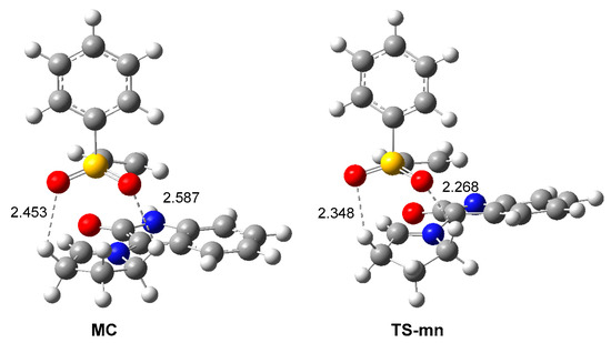 Analysis of the geometry of the most favorable TS-mn shows that the two oxygen atoms of the sulfonyl group of the vinyl sulphone 20 are located at 2.27 and 2.35 Å from two methylene hydrogens of the proline residue (see Figure 5). These short distances suggest the presence of two HBs at endo TS-mn, which are not at the exo TS-mx. These HBs, which are already present at the most favorable MC, can be responsible for the high stabilization in gas phase of MC with respect to the separated reagents; ca. 16 kcal·mol−1 (see Scheme 5).