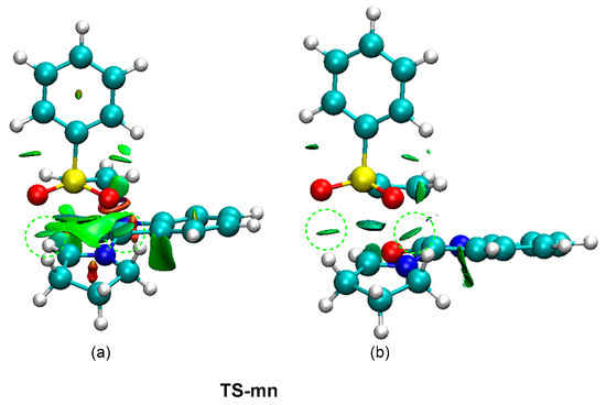 In order to characterize the presence of the two HBs at the most favorable TS-mn, a topological analysis of the non-covalent interactions (NCI) [47] taking place at this TS was performed. The NCI surfaces are shown in Figure 6. The topological analysis of the NCI at TS-mn shows the presence of two green surfaces at the interatomic separation between the two oxygen atoms of the sulfonyl group and the two methylene hydrogens of the proline residue. In order to characterize the rather attractive nature of these surfaces, the NCI interactions at TS-mn were decomposed into their attractive (sign(λ2)ρ(r) < 0) counterpart (see Figure 6b). As can be observed, after removing the repulsive interactions, two green surfaces at the two HBs regions are observed. Consequently, formation of two HBs at MC and TS-on along the meta/endo reaction path may be responsible for the high stabilization of MC with respect to the separated reagents, and hence for the endo stereoselectivity found in this pmr-type 32CA reaction.