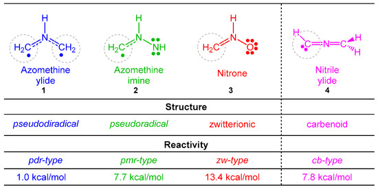 The understanding of the 32CA reactions is a challenge for organic chemists as a consequence of the chameleonic electronic structures of the three-atom-components (TACs) participating in these reactions [5,6,7,8]. Unlike the Diels–Alder reactions in which the diene is characterized by a unique Lewis structure, recent Molecular Electron Density Theory (MEDT) [9] studies of 32CA reactions have categorized four different types of TACs participating in this class of cycloaddition reactions [5,6,7,8], i.e., pseudodiradical, pseudo(mono)radical, carbenoid, and zwitterionic TACs (see Scheme 1). These MEDT studies have allowed establishing a very good correlation between the electronic structure of the simplest TACs and their reactivity towards ethylene 5 [10]. Accordingly, 32CA reactions have been classified into pseudodiradical (pdr)-, pseudo(mono)radical (pmr)-, carbenoid (cb)-, and zwitterionic (zw)-type reactions, respectively (see Scheme 1) [10], in such a manner that while pdr-type 32CA reactions take place very easily [5], zw-type 32CA reactions demand suitable nucleophilic/electrophilic activations of the reagents (see Scheme 1) [7].