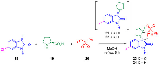 Thus, the 32CA reaction of AY 21, generated in situ from the reaction of 6-chloroisatin 18 and L-proline 19, with phenyl vinyl sulphone 20 yielded the spirooxindole 23 with total meta regio- and endo stereo-selectivities (see Scheme 5) [25].