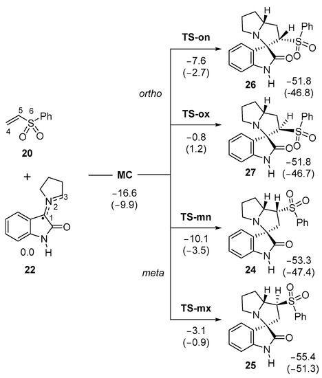 The thermodynamic data of the 32CA reaction of AY 22 with vinyl sulphone 20 were subsequently analyzed. The relative enthalpies, entropies, and Gibbs free energies, computed at 65 °C, are given in Table 2. Addition of the thermal corrections to the electronic energies in methanol increases the relative enthalpies by between 1.6 and 4.4 kcal·mol−1. Those of the TSs are only increased by less than 1.6 kcal·mol−1. Inclusion of entropies to enthalpies increases the relative Gibbs free energies by between 11.1 and 17.3 kcal·mol−1 due to the unfavorable activation entropies associated with this bimolecular reaction, which are found in the range −32.8 and −51.2 cal·mol−1·K−1. The activation Gibbs free energy associated with this 32CA reaction via TS-mn rises to 13.1 kcal·mol−1, while formation of 24 remains exergonic by −26.8 kcal·mol−1. Consequently, spirooxindole 24 is formed by kinetic control.