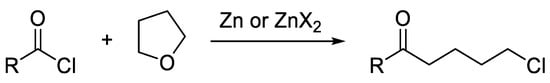 The latter strategy shows several advantages, because it is more selective, cheap, and green, as no other metal has to be used except zinc, and there is no need for other more reactive, and less selective, reactants [,,]. However, the use of organozinc halides prepared by direct insertion, especially those obtained from iodides, is known to be problematic for acylative cross-couplings, because Zn species catalyze side reactions of the acyl chloride with the ethereal solvent (Scheme 2) [].