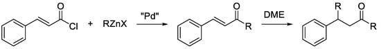 - Negishi, E.; Bagheri, V.; Chatterjee, S.; Luo, F.-T.; Miller, J.A.; Stoll, A.T. Palladium-Catalyzed Acylation of Organozincs and Other Organometallics as a Convenient Route to Ketones. Tetrahedron Lett. 1983, 24, 5181–5184. [Google Scholar] [CrossRef]