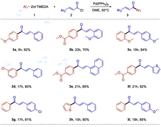 With the optimized reaction conditions, the applicability and robustness of the protocol was proved, using different organozinc iodides as well as different cinnamoyl chlorides. As shown in Scheme 4, several substituents on both the reaction partners are well-tolerated. Electron-rich, as well as electron-poor arylzinc halides can be employed and different substituted cinnamoyl chlorides have been used. Moreover, the reaction does not suffer steric hindrance on the nucleophile, and even heteroaryl derivatives can be synthesized. It is important to note that some of the obtained products (3b, 3e, 3f) have functional groups that are not compatible with polarized organometallic compounds such as Grignard or organolithium reagents; therefore, their synthesis using arylzinc halides prepared by transmetalation from these kinds of reactants is not feasible without the use of very low temperatures []. It is also important to note that the direct synthesis of electron-rich arylzinc halides, such as the ones required to synthesize 3a and 3c, requires very short times if compared with other literature methods [].