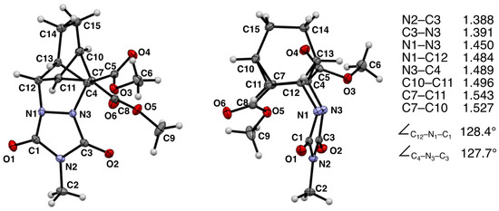 Heating a solution of MeTAD and 10a in 1,2-dichloroethane for 24 h resulted in a single isolable product that was identified as a homo-DA adduct 12a (55% yield). The 1H NMR spectrum was similar to that collected for 11a, and the structural assignment was supported by the expected proton connectivities revealed in the COSY spectrum (see Supplementary Materials). Fortunately, this homo-DA adduct was particularly crystalline in nature which enabled us to confirm the structures of these strained heterocycles. This was a notable accomplishment given that we were unable to find an instance in the literature in which the fundamental structures of these diaza homo-DA adducts had been definitively determined via X-ray crystallography. Slow cooling of a saturated boiling solution of 12a in methanol produced colorless plates suitable for X-ray analysis. The observed structure is provided in Figure 1 from two different vantage points. Therefore, both the presence of the strained cyclopropyl ring and the connectivity of the urazole ring system to the carbon framework were confirmed. Some selected bond lengths and bond angles are provided (see Figure 1).