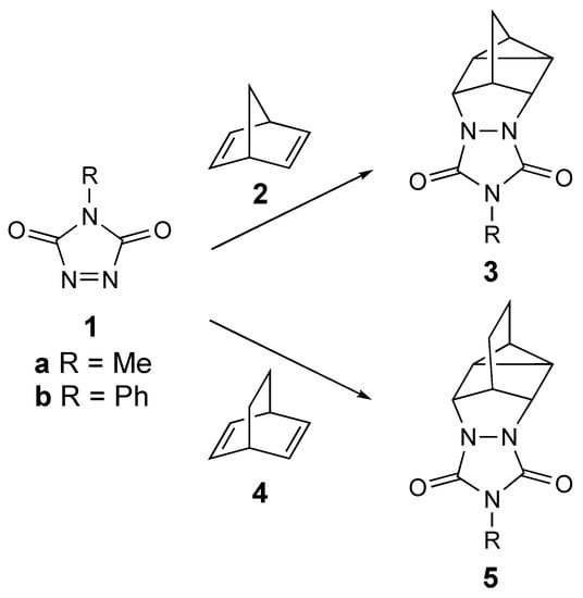 - Adam, W.; De Lucchi, O.; Peters, K.; Peters, E.-M.; von Schnering, H.G. Reaction of Bicyclo[3.2.1]octadiene with 1,2,4-triazoline-3,5-diones: Competitive Dipolar and HomoCycloaddition. J. Am. Chem. Soc. 1982, 104, 161–166. [Google Scholar] [CrossRef]