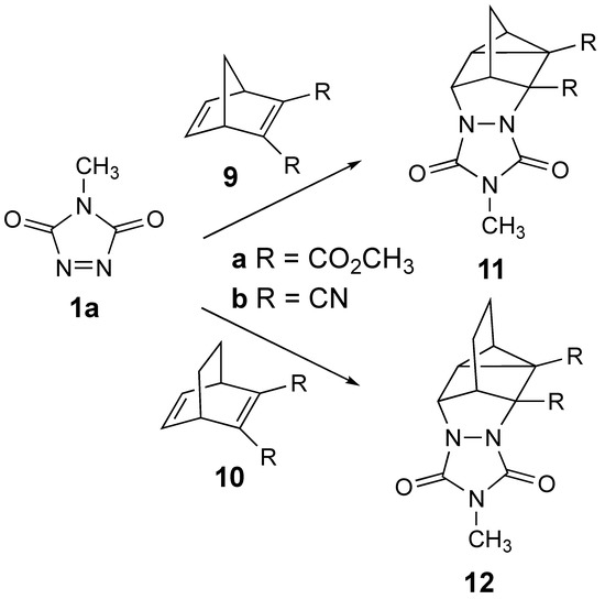 The disubstituted bicyclo-2,5-dienes 9a,b and 10a,b were synthesized according to the procedures described in the literature [18,19]. The reaction of equimolar amounts of MeTAD with 9a in 1,2-dichloroethane as a solvent was allowed to proceed for three weeks at room temperature until the deep red color of the MeTAD was discharged. Analysis of the crude reaction mixture by TLC and 1H NMR spectroscopy suggested a complete consumption of the starting materials and the formation of a single major product. Careful column chromatography resulted in a 15% yield of the homo-DA adduct 11a. The structural assignment was consistent with the results from the 1H, 13C, and COSY NMR spectral analyses (spectra are provided in the Supplementary Materials). Although refluxing the reaction mixture in 1,2-dichloroethane (~80 °C) drove the reaction to completion within six hours, the yield was not improved (14% yield). For both reactions, in addition to 11a, only intractable, undefined materials that often accompany triazolinedione reactions were formed, as Adam has also reported [8,9].