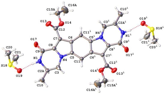 Yellow single crystals of pyrrolo[2,3-f]indole 26 suitable for X-ray diffraction were obtained by recrystallization in DMSO. X-ray intensity data were collected at 293(2) K on an Agilent SuperNova diffractometer with monochromated Mo-Kα radiation (λ = 0.71073 Å). The images were interpreted and integrated with CrysAlisPRO [52] and the implemented absorption correction was applied. The structure was solved using Olex2 [53] with the ShelXT [54] structure solution program using Intrinsic Phasing and refined with the ShelXL [55] refinement package using full-matrix least-squares minimization on F2. Non-hydrogen atoms were refined anisotropically and hydrogen atoms in the riding mode with isotropic temperature factors were fixed at 1.2 times the Ueq of the parent atoms (1.5 times Ueq for methyl groups). Hydrogen atom H1 attached to N1 was located in a difference electron density map and subsequently freely refined. The asymmetric unit consisted of half a molecule and one molecule of DMSO. The whole molecule was generated by inversion symmetry. Atom C2 (flap of piperazine ring) and atoms C15 and C16 (ethoxy group) were found to be disordered over two positions, with occupancies of 0.518(17):0.482(17) for C2 and 0.62(3):0.38(3) for C15, C16. The structure was refined as a two-component twin (BASF = 0.289). Olex2 [53] was used for the structure presentation in Figure 2.