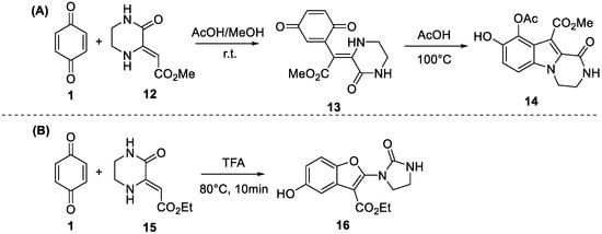 (A) Parr and Reiss, the condensation of a cyclic enamine and p-benzoquinone, data from [44]; (B) Unexpected formation of a rearranged benzofuran, data from [23].