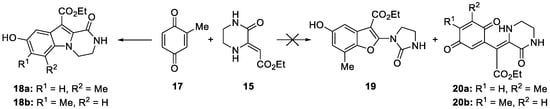 Ethyl-2-(5-methyl-3,6-dioxocyclohexa-1,4-dien-1-yl)-2-(3-oxopiperazin-2-ylidene)acetate (20a) and ethyl-2-(4-methyl-3,6-dioxocyclohexa-1,4-dien-1-yl)-2-(3-oxopiperazin-2-ylidene)acetate (20b).