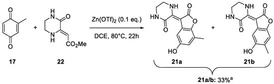 As mentioned above, scandium and zinc triflate mediation allowed the formation of an alternative reaction product: benzofuranone 21a (Scheme 5). Presumably, this heterocycle is formed via the acid-catalyzed lactonization of hydroquinone intermediate I12 (Scheme 5). This hypothesis is substantiated by the studies of Panisheva et al. and Mikerova et al., which showed that sterically demanding enamino hydroquinones readily cyclize to benzofuranone derivatives in acidic medium [46,47]. Aside from this two-step synthesis via isolated enamino hydroquinones [46,47], benzofuranones have rarely been described as products from the Nenitzescu reaction. Sung et al. reported the formation of benzofuranones via the Blaise–Nenitzescu reaction, which occurs by the condensation of an in situ-generated zinc complexed enaminoester and a quinone [48]. However, the authors were not able to synthesize benzofuranones starting from the isolated enamine (Blaise product). Mbala et al. afforded hydroxybenzo[g]furo[4,3,2-de]isoquinoline-2,5(4H)-diones from the condensation of N-substituted enaminoesters with methoxycarbonyl-1,4-naphthoquinone [49]. However, in this condensation an isoquinolinone ring is formed in addition to the benzofuranone ring. So, it can be stated that there is very little/no precedent for benzofuranone formation as a direct product from the classical Nenitzescu reaction. For this reason, a limited optimization study was undertaken (Table 2). During the optimization, NMR analysis indicated the presence of a small amount of the 6-methyl substituted isomer 21b in the reaction mixtures, though isolation was unsuccessful.