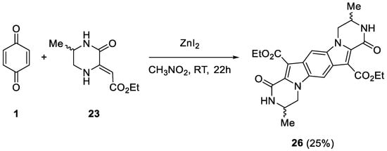 To a flame-dried, nitrogen-flushed reaction tube equipped with a stir bar, piperazinone enaminoester 23 (199 mg, 1.00 mmol, 1.00 eq.), p-benzoquinone (216 mg, 2.00 mmol, 2.00 eq.), nitromethane (4 mL), and ZnI2 (34 mg, 0.11 mmol, 0.11 eq.) were added. After stirring the reaction at room temperature for 22 h, during which the product crystallized from the reaction mixture, the mixture was vacuum filtered. The obtained solid was heated in nitromethane and centrifugated, and the precipitate was dried in vacuum to afford product 26 as a yellow solid (59 mg, 0.13 mmol, 25%); Mp: >300 °C. After recrystallization in DMSO, the product was identified by single-crystal X-ray diffraction (Figure 2). HRMS (ESI-Q-TOF): m/z [M+H]+ calcd. for C24H26N4O6: 467.1925; found: 467.1927.