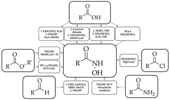 - Alam, M.A. Methods for Hydroxamic Acid Synthesis. Curr. Org. Chem. 2019, 23, 978–993. [Google Scholar] [CrossRef]