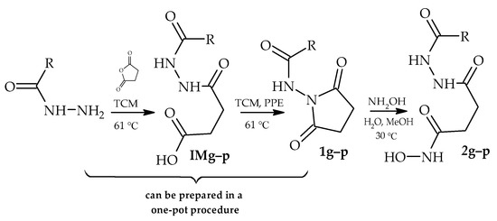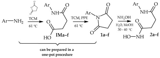 Hydroxamic acids belong to a very important class of compounds for anticancer drug development [1] because of their ability to inhibit metalloenzymes [2] such as histone deacetylase (HDAC) [3,4] or matrix metalloproteinase (MMP) [5,6]. Additionally, these compounds are of great interest for the development of such a modern field of organic chemistry as oxidative coupling reactions [7,8,9]. There are several well-known reactions for the synthesis of hydroxamic acids (see Figure 1) that involve carboxylic acids, esters, amides and aldehydes as starting compounds with different reaction activation additives (N,N-dimethylchloromethaniminium chloride, ethyl chloroformate, 1-methanesulfonyl-1H-benzotriazole MSBT, cyclic phosphonic anhydride PPAA, etc.) or catalysts (KCN, Fe3+, MgO, etc.) [2,10,11]. One more reaction that we believe can expand the possibilities for the synthesis of a broad number of new compounds with hydroxamic acid group is the five-membered imide cycle opening by ammonia derivatives [12,13,14]. Recently [15], based on the reaction of N-substituted succinimides with hydroxylamine, we developed a novel approach that features simple and mild conditions. Here, we report a detailed description of the developed approach, which consists of two steps: (i) the synthesis of N-substituted succinimides by the reaction of succinic anhydride with amines in chloroform in the presence of polyphosphate ester and (ii) the treatment of N-substituted succinimides by hydroxylamine aquatic solution.