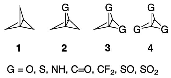 - Wiberg, K.B. Small-Ring Propellanes. Chem. Rev. 1989, 89, 975–983. [Google Scholar] [CrossRef]