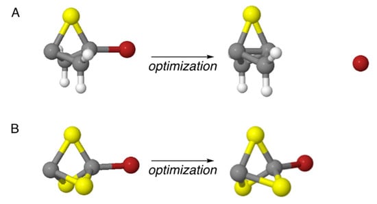 The geometries of the anionic bridgehead bromide compounds 12, 13, and 14 (see Scheme 3) were optimized at the ωB97X-D/aug-cc-pVDZ level of theory. Note that, for those compounds with multiple N-H bonds or S-O bonds, the H/O atoms were oriented so as to be in a uniform clockwise direction. In addition, while we used NH bonds to simplify the calculations, an N-H bond would be incompatible with the formation of bridgehead anions, and the use of N-R derivatives would be more practical (e.g., R = Me). For all the compounds, optimization led either to ejection of the Br atom as a bromide ion and formation of the corresponding propellane, or simple optimization of the originally guessed geometry for the anionic bridgehead bromide compounds. In no cases were ring-opened or alternative products formed. If propellane formation did not occur, a frequency calculation was carried out on the optimized anionic bridgehead bromide compounds to ensure that it was a stationary point at an energy minimum. The results of these optimizations are compiled in column 3 of Table 1. As representative examples of the outcomes of these optimizations, the result of the optimization of precursor 12O that led successfully to propellane 2O is shown in Figure 3A, and the optimization of precursor 14O that did not result in the formation of propellane 4O, but only in the optimization of the geometry of 14O, is shown in Figure 3B. A video showing the iterative steps involved in the optimization of precursor 12O to form 2O is provided in the Supplementary Materials.