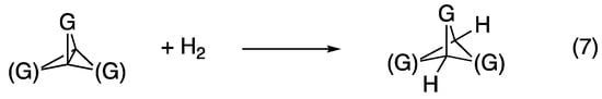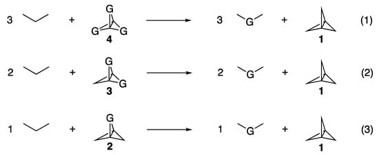 Pittman’s isodesmic equation to estimate the overall strain energy of trisubstituted propellanes 4 relative to unsubstituted 1 is represented by Equation (1) []. Extension of this methodology to the mono- and disubstituted propellanes 2 and 3 are represented by isodesmic Equations (2) and (3).