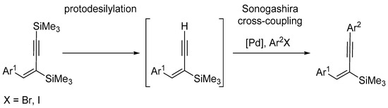If the synthesis target involves 1,4-diaryl-1,3-enynes that have aryl groups placed in mutual syn positions (Figure 1b), cross-coupling [17,18,19,26,36,37,38] is the only suitable synthetic route. Given the availability of procedures for the selective synthesis of silylated enynes (Figure 1c), the most convenient method for the preparation of (Z)-1,4-diaryl-1,3-enynes is the protodesilylation of the silyl derivatives followed by Sonogashira coupling with aryl halides [39,40,41,42,43,44]. Alternatively, a one-step sila-Sonogashira coupling of the silylated enynes with aryl halides (E in Scheme 1) can be used [45]. These reports are listed in Table S1 in the Supplementary Materials. However, such a sequence of reactions has not been developed into a general method for the synthesis of conjugated enynes with defined stereochemistry. To address this limitation, we report an efficient and general procedure for the synthesis of (E)-1,4-diaryl-2-(trimethylsilyl)but-1-en-3-ynes via the one-pot sequence of selective protodesilylation and Sonogashira coupling (Scheme 2).