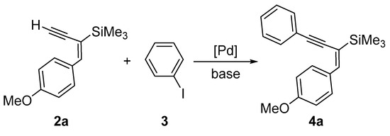 After establishing the protodesilylation conditions, we investigated the Sonogashira coupling of terminal enyne with aryl bromides (or iodides) to find a convenient and efficient procedure. To find the optimum catalyst, base, and reaction conditions, studies were carried out using the cross-coupling of (E)-1-(4-methoxyphenyl)-2-trimethylsilylbut-1-en-3-yne (2a) with iodobenzene (Scheme 4) as a test reaction.