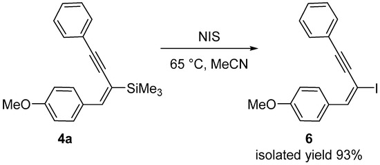 The method described by Pawluć and Marciniec [47] was adapted for the iododesilylation of 4a. Halodesilylation of 1,3-enyne with N-iodosuccinimide (NIS) at room temperature did not lead to the formation of 6. Treatment of an acetonitrile solution of (E)-1-(4-methoxyphenyl)-2-(trimethylsilyl)-4-(phenyl)but-1-en-3-yne (4a) with NIS at 65 °C for 5 h afforded the compound 6 in 93% yield (Scheme 7). We only found one paper in the literature describing a similar iododesilylation at position 2 of conjugated enyne [48].