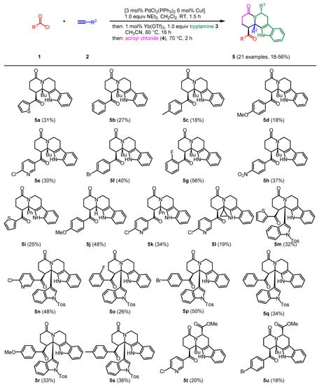 The initial Sonogashira coupling of acid chlorides 1 with alkynes 2 proceeded efficiently in dichloromethane as a solvent within 1–2 h by using only a single equivalent of triethylamine as a base. Poor solubility of ytterbium (III) triflate and tryptamine (3a) in the Michael step (which led to suspensions and prolonged reaction times) was overcome by the addition of acetonitrile as a cosolvent (CH2Cl2/CH3CN 1:1) and by placing the reaction vessel in an oil bath at 80 °C. Acetonitrile, as the sole solvent medium, was discarded due to incomplete conversions of some substrates in the initial Sonogashira step. The lower effective concentration in the Michael step required a longer reaction time of 16 h for full conversion. The terminal aza-anellation Pictet–Spengler step proceeded at 70 °C in the same reaction vessel to terminate the sequence and to give THBCs 5 after a single chromatographic purification.