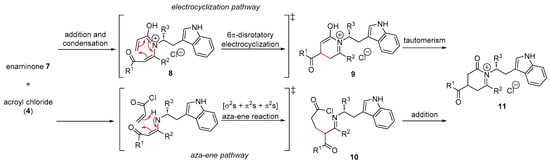All the recorded 1H NMR spectra support the strict diastereoselectivity of the presented MCR, forming a single diastereomer of compound 5. As reported previously, the concluding Pictet–Spengler step, which essentially represents an intramolecular electrophilic aromatic substitution at the pyrrole fragment of the indole core, determines the relative syn-relation between the substituents at carbon centers C4 and C5 in the pyridone part [13]. The previously observed syn-orientation of the substituent at C3 demands a cyclic rather than an open transition state of the aza-anellation step, which suggests two alternative mechanistic scenarios via pericyclic elementary steps (Figure 3). On the one hand, nitrogen attack of the (Z)-configured enaminone 7 on the carbonyl function of acryloyl chloride (4) and condensation could result in an azonia hexatriene structure 8, which could undergo a disrotatory ring closure to the dihydropyridinium enol intermediate 9 (electrocyclization pathway), which could easily tautomerize to the acyliminium ion 11. The electrophilic iminium moiety in 11 could attack the indole with the face opposite to the adjacent carbonyl substituent, resulting in a syn-orientation of carbonyl substituent and R2 [28].